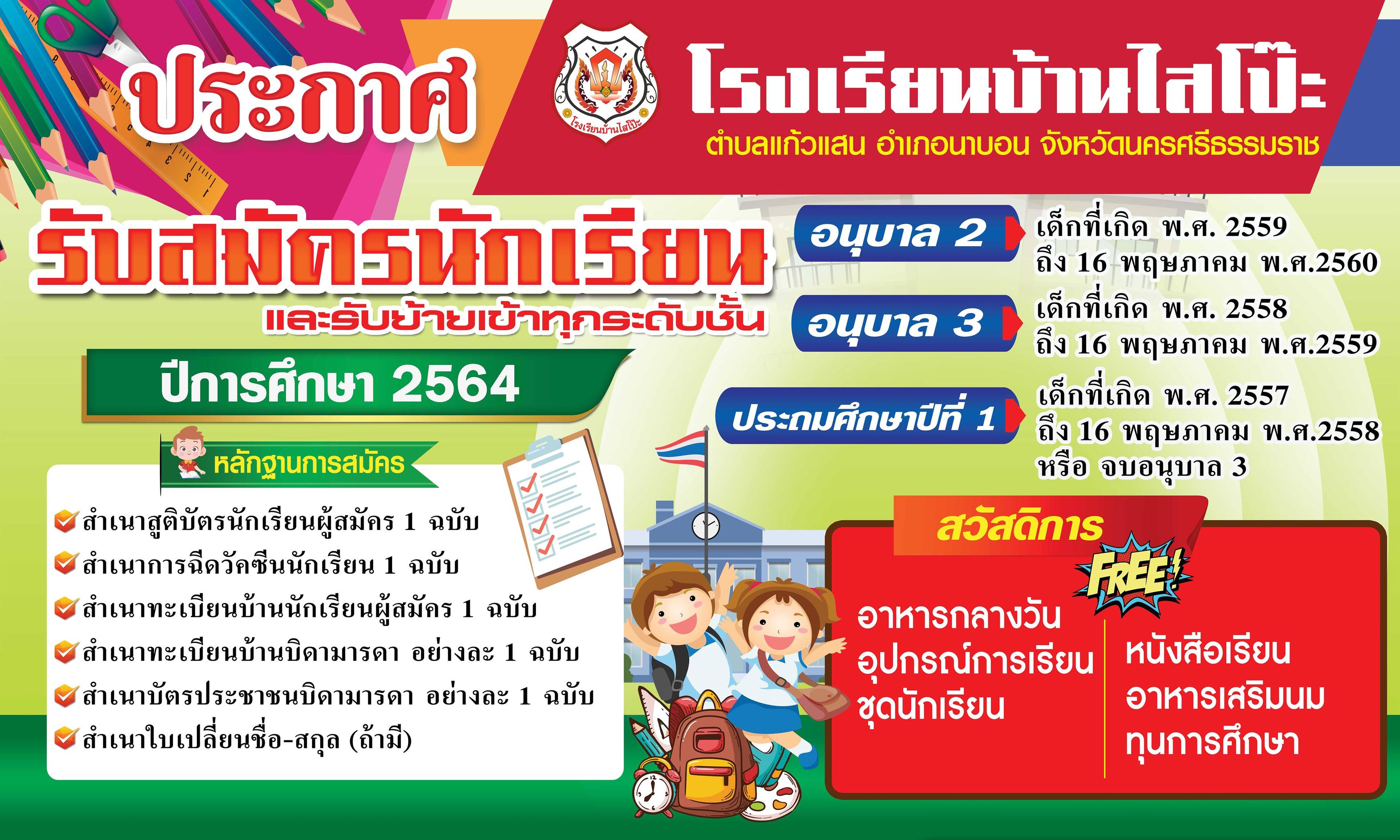 โรงเรียนบ้านไสโป๊ะรับสมัครนักเรียนใหม่ ปีการศึกษา 2564 ตั้งแต่บัดนี้เป็นต้นไป