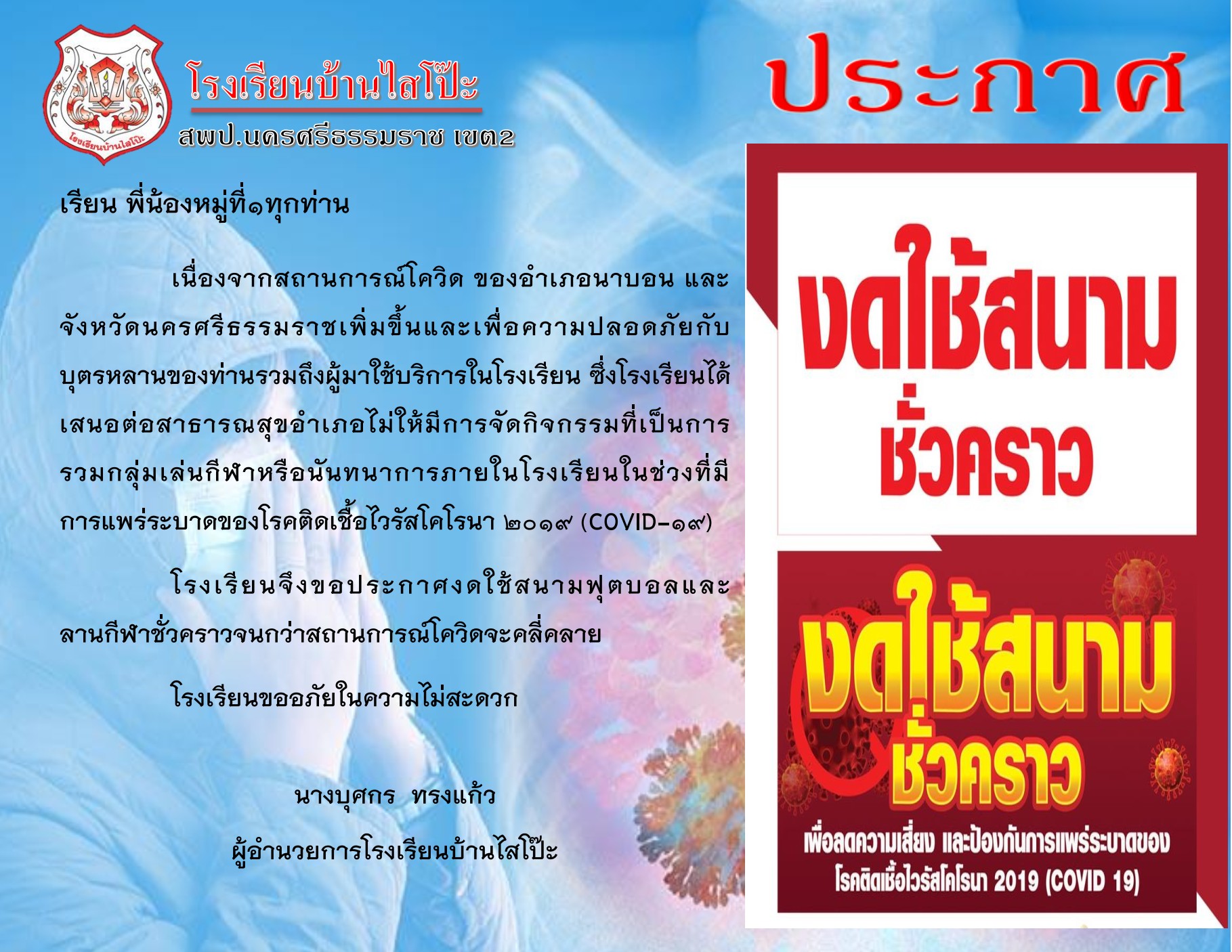 เนื่องด้วยสถานการณ์การแพร่ระบาดของโรคติดเชื้อไวรัสโคโรนา 2019 (COVID-19)และเพื่อป้องกันการแพร่ระบาดโรงเรียนบ้านไสโป๊ะจึงขอประกาศงดให้บริการสนามโรงเรียนชั่วคราว
