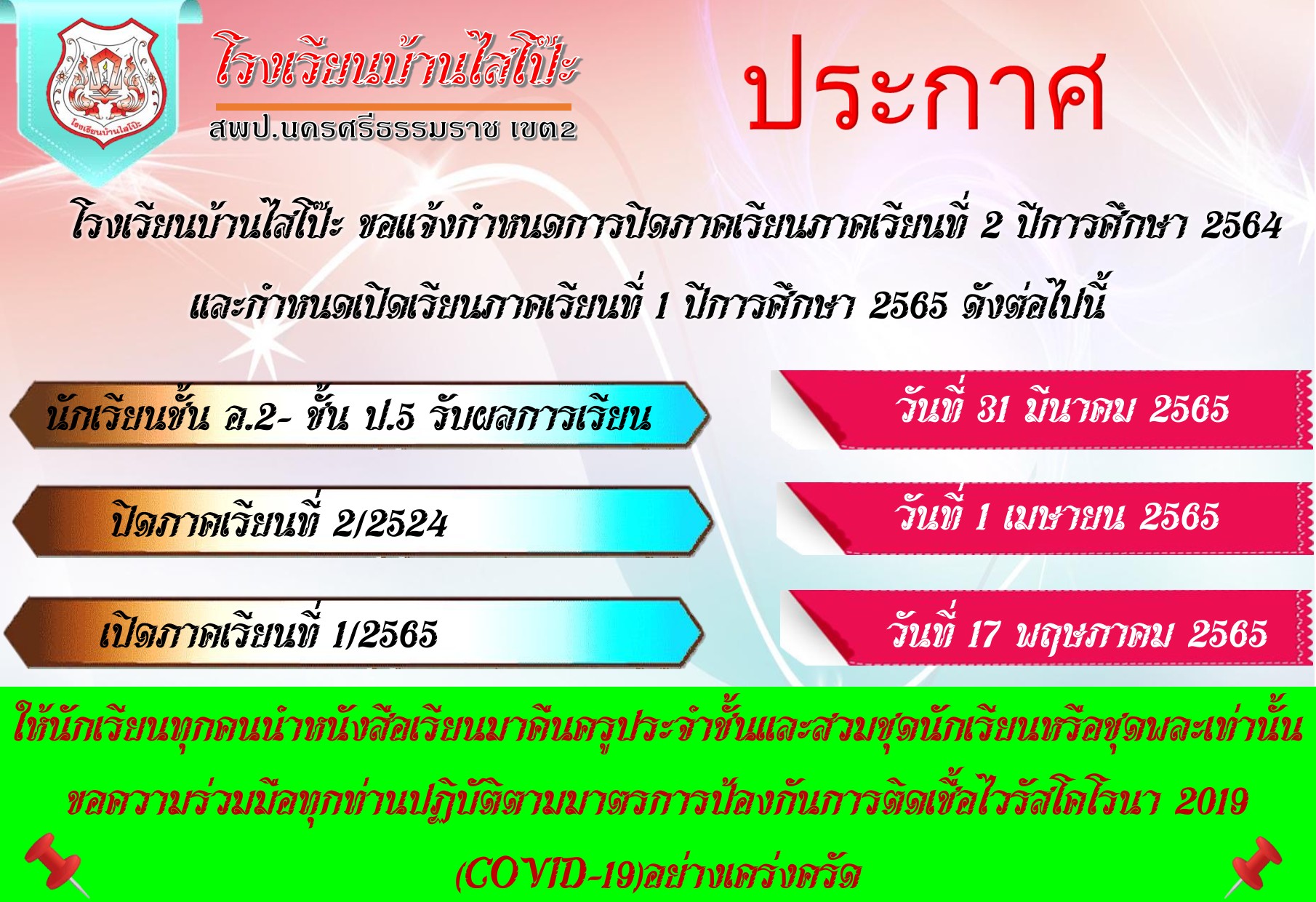 กำหนดการปิดภาคเรียนที่ 2 ปีการศึกษา 2564 และ เปิดภาคเรียนที่ 1 ปีการศึกษา 2565
