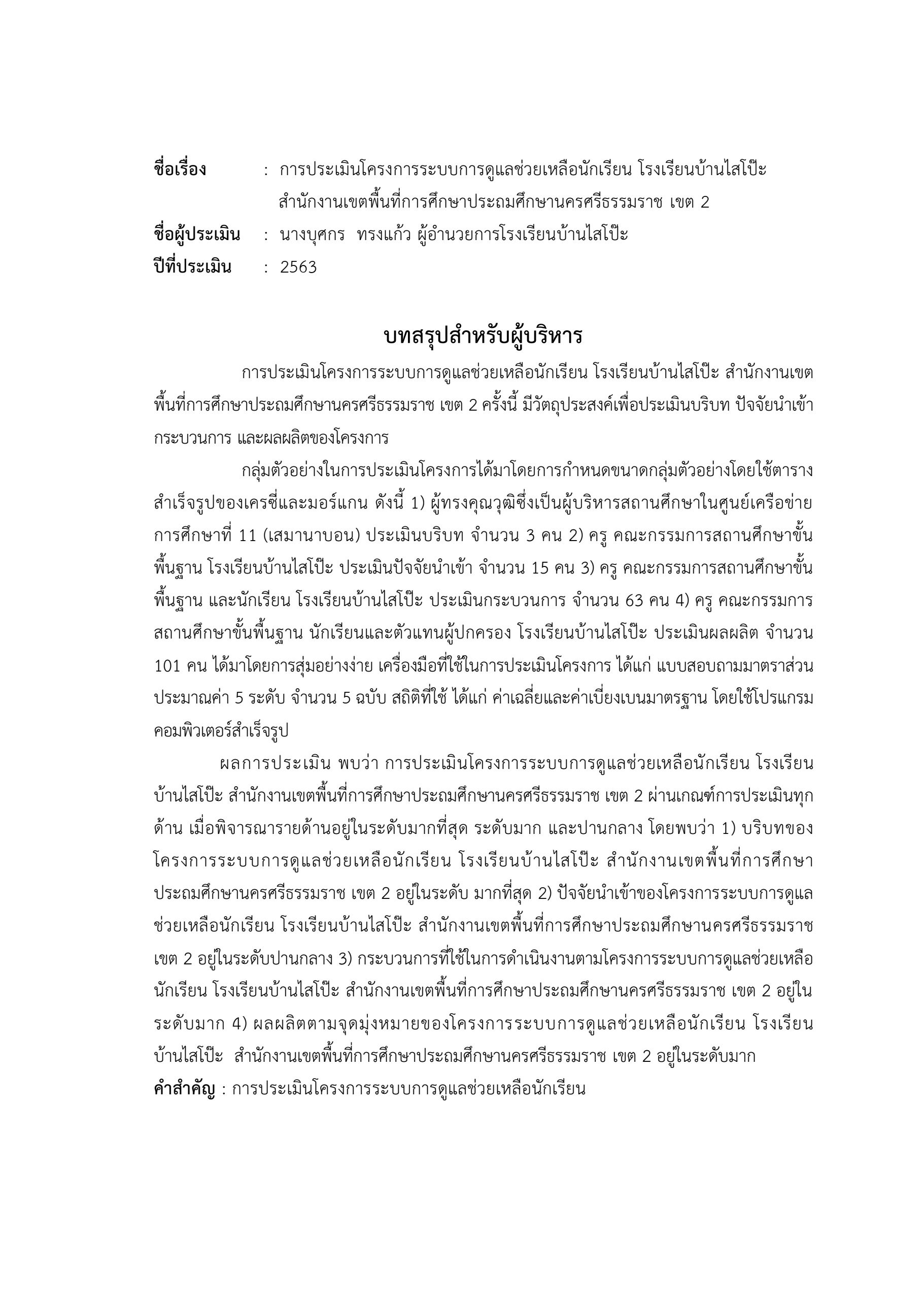 การประเมินโครงการระบบการดูช่วยเหลือนักเรียน โรงเรียนบ้านไสโป๊ะ สำนักงานเขตพื้นที่การศึกษาประถมศึกษานครศรีธรรมราช  "บทสรุปสำหรับผู้บริหาร"