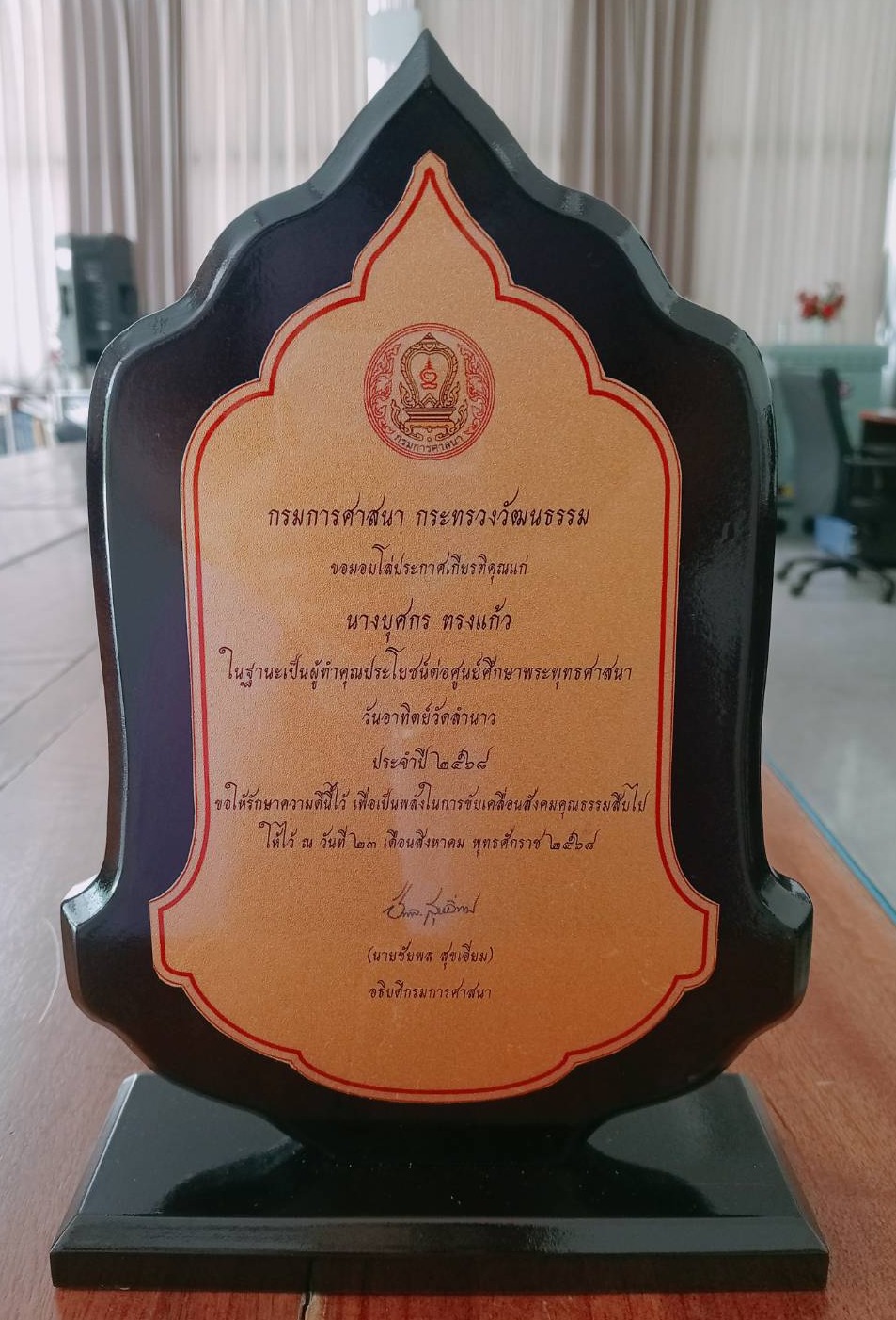 เข้ารับโล่ประกาศเกียรติคุณ ประเภทบุคคล ในฐานะเป็นผู้ทำคุณประโยชน์ต่อศูนย์ศึกษาพระพุทธศาสนา วันอาทิตย์วัดลำนาว ประจำปี 2568